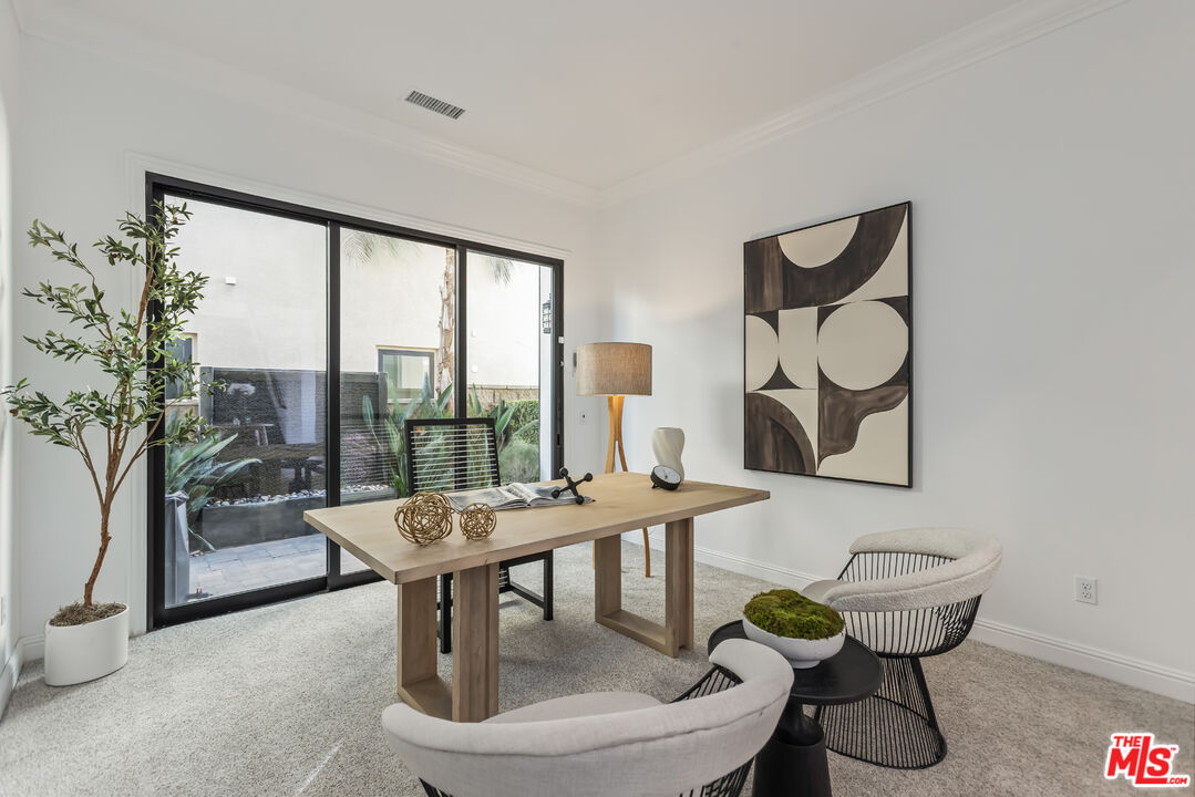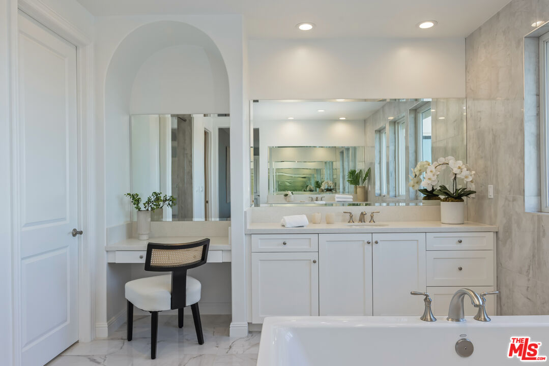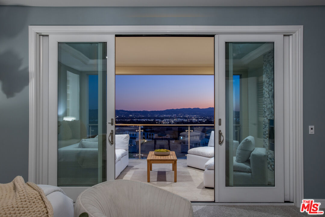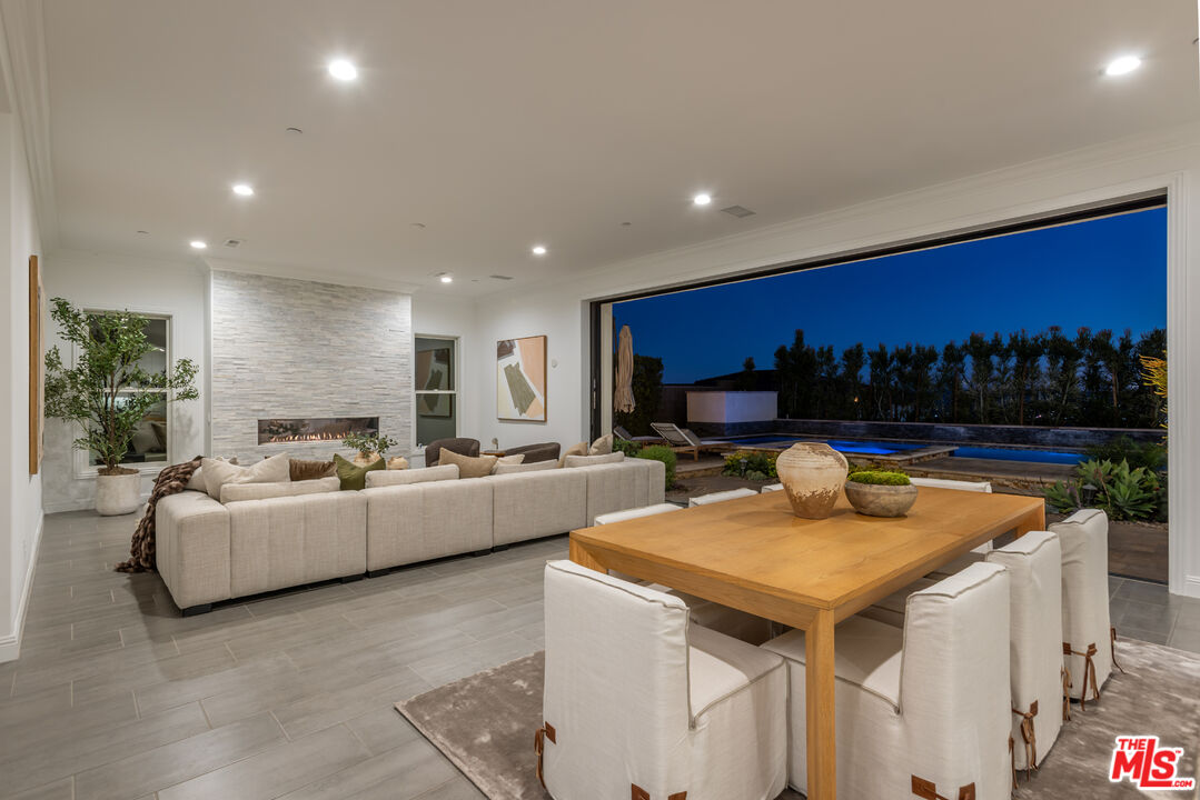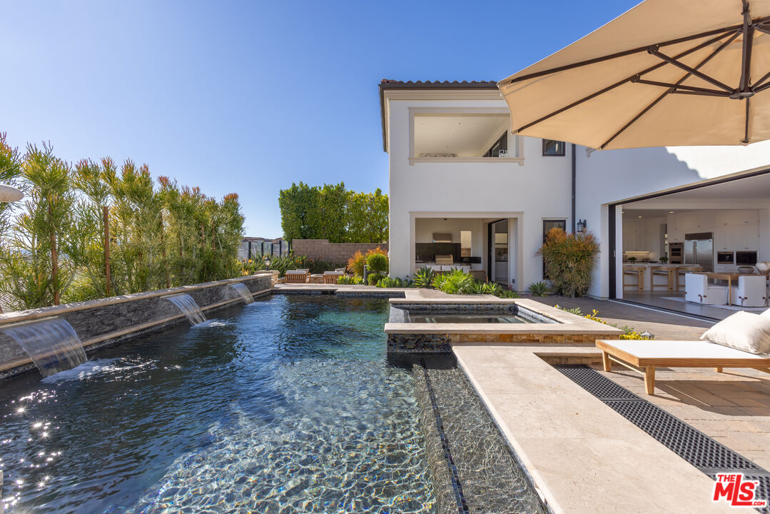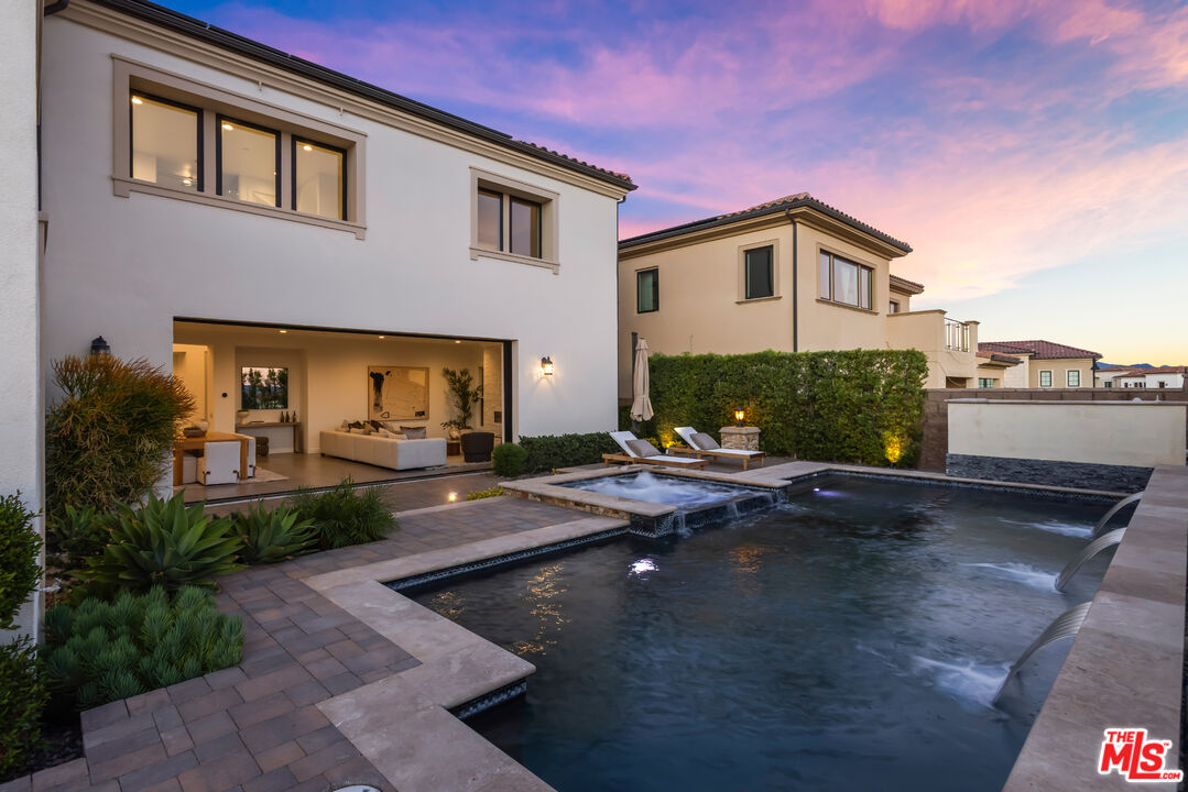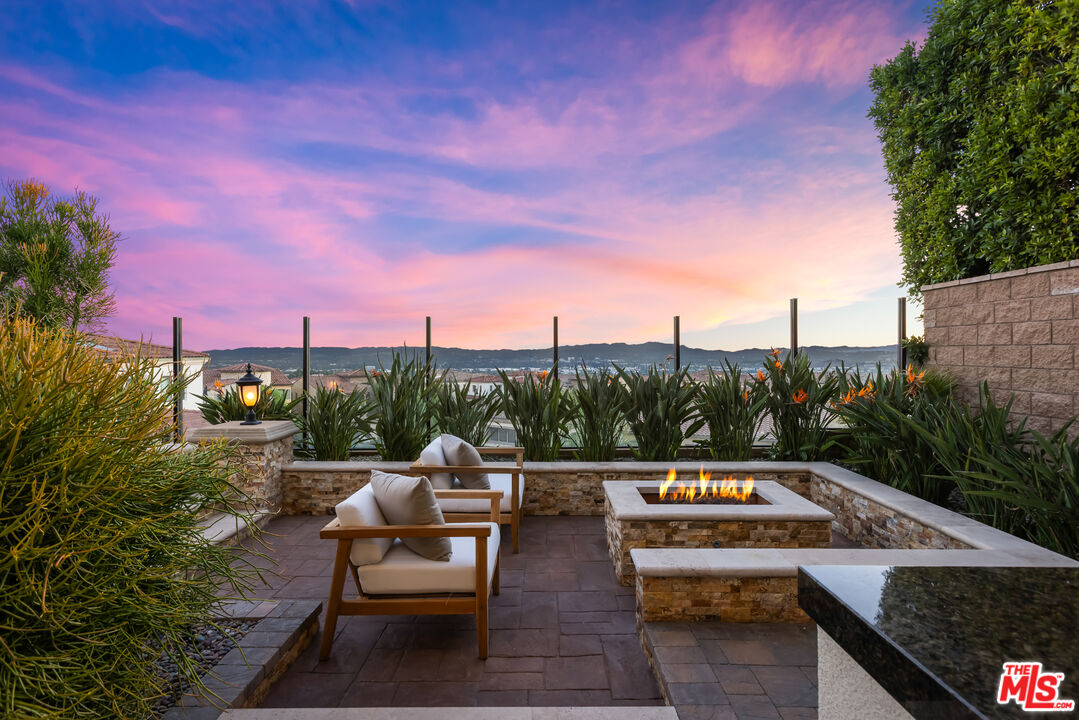 Perched atop a hill within the prestigious, guard-gated community of Westcliffe at Porter Ranch, this newly reimagined five-bedroom, five-and-a-half-bath residence offers sweeping city and valley views. The impressive foyer opens to a bright, airy floor plan where the expansive living room, formal dining area, and Chef's kitchen blend seamlessly. Two large pocket sliding doors vanish into the walls, extending the interior into the beautifully landscaped backyard, complete with pool, spa, fountains, outdoor kitchen, and fire pit. The sizable Chef's kitchen features dual waterfall islands, premium WOLF appliances including dual ovens and a built-in coffee station, a SubZero refrigerator, bespoke cabinetry, and a large walk-in pantry. A main-level office, converted gym, and guest suite ensure privacy for visitors. Upstairs, a spacious bonus room offers endless possibilities as either a media room, a home office, or a play area. The grand primary suite is complete with a private balcony featuring a cozy fireplace that overlooks the valley below. The spa-like ensuite bath showcases a freestanding soaking tub, an oversized walk-in shower, dual vanities, and a large custom closet. Designed with modern comfort and sustainability in mind, the home includes an EV charger and a wholly owned solar system with 45 panels, resulting in near-zero energy costs. Ideally positioned near The Vineyards at Porter Ranch, home to high-end shopping, dining, and entertainment such as Whole Foods, La Popular, and AMC Theater, this Toll Brothers Cahill residence also offers access to acclaimed schools.
